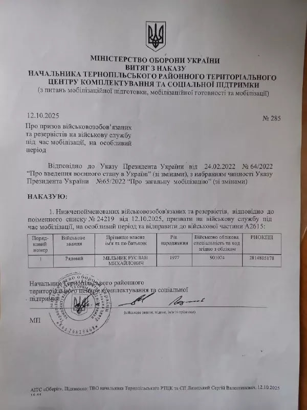 "Отримали ми і витяг з ТЦК та СП, що чоловік вже мобілізований. Тому ще зранку 20 жовтня звернулися за коментарем до Тернопільського ТЦК та СП. Протягом дня кілька разів цікавилися, коли зможемо отримати коментар структури з приводу мобілізації Руслана Мельника. Нам щоразу обіцяли, що коментар нададуть згодом. У момент виходу публікації коментаря ТЦК та СП ми так і не отримали. Проте готові його опублікувати", — йдеться в матеріалі.