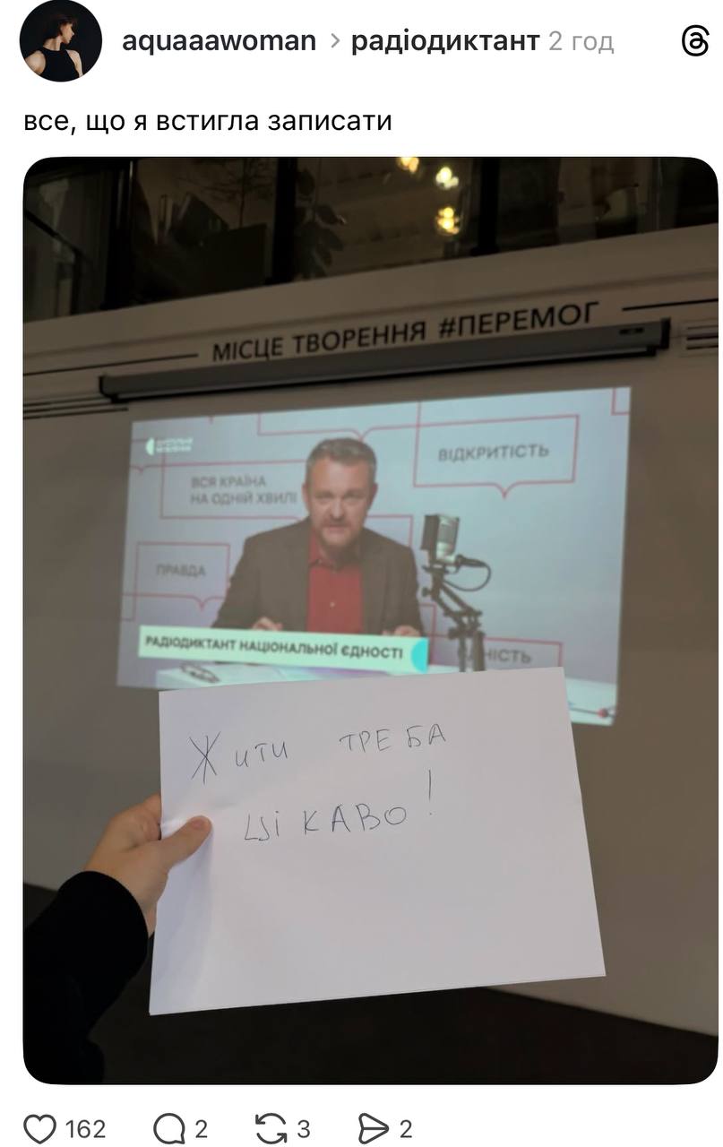 27 жовтня в Україні традиційно відбувся Радіодиктант національної єдності, але цього року він перетворився не лише на мовний марафон, а й на хвилю мемів. Після трансляції соцмережі буквально вибухнули жартами про надто швидке читання тексту, який багато хто просто не встиг записати.