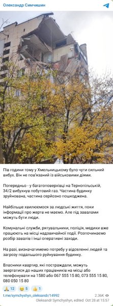 "Сьогодні, 28 жовтня, близько 15.00 у Хмельницькому по вулиці Тернопільській було чути вибух. За попередньою інформацією, стався вибух побутового газу. На місце події виїхали екстрені служби та слідчо-оперативна група поліції", — повідомили правоохоронці.