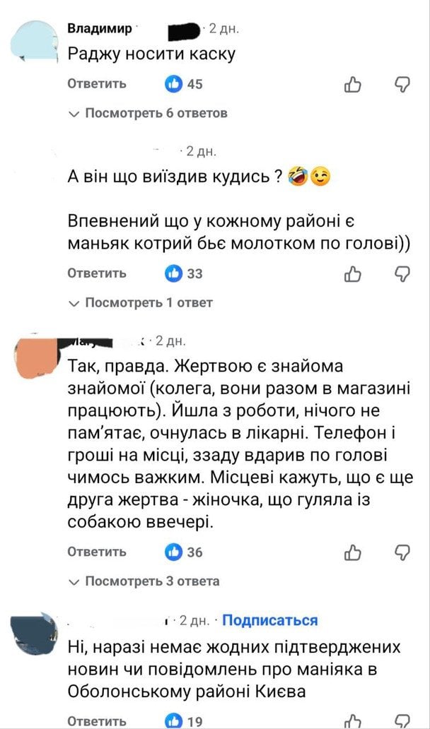 Проте окремі користувачі пишуть, що спокійно прогулюються вечорами по Оболоні й про маніяка чують вперше.