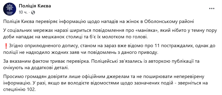 Раніше у Facebook користувачка під ім’ям Tatiana Skripka опублікувала допис, у якому заявила про нібито серію нападів в Оболонському районі. За її словами, "на районі орудує маніяк", який у темний час доби підходить до жінок та вдаряє їх по голові молотком. У повідомленні йшлося про щонайменше 11 постраждалих, які нібито перебувають у лікарнях. Авторка припустила, що нападник може бути місцевим жителем, адже діє в одному й тому ж секторі, і навіть був випадок, коли його намагалися переслідувати, але він зміг непомітно зникнути між будинками.