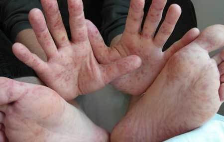 - висип у вигляді пухирців на долонях, ступнях, у роті;