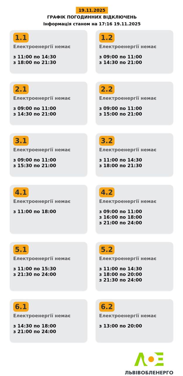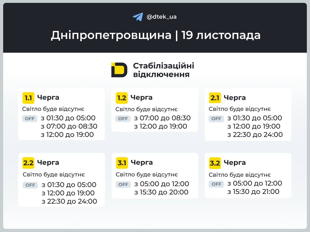 Стабілізаційних відключень впродовж 19 листопада буде більше. З чим це пов'язано — не повідомляється, але ймовірною причиною є російська атака ракетами та ударними дронами на українську енергетику.