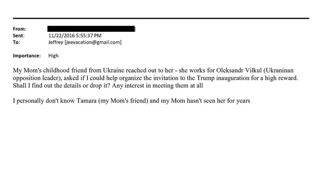 "Подруга дитинства моєї мами з України зв'язалася з нею — вона працює на Олександра Вілкула (лідера української опозиції) — і запитала, чи можу я допомогти організувати запрошення на інавгурацію Трампа за високу винагороду. Мені дізнатися деталі чи відмовитися? Чи є у вас взагалі бажання зустрітися з ними? Я особисто не знаю Тамару (подругу моєї мами) і мама не бачила її роками", — йдеться в тексті, скан якого з'явився в пресі.