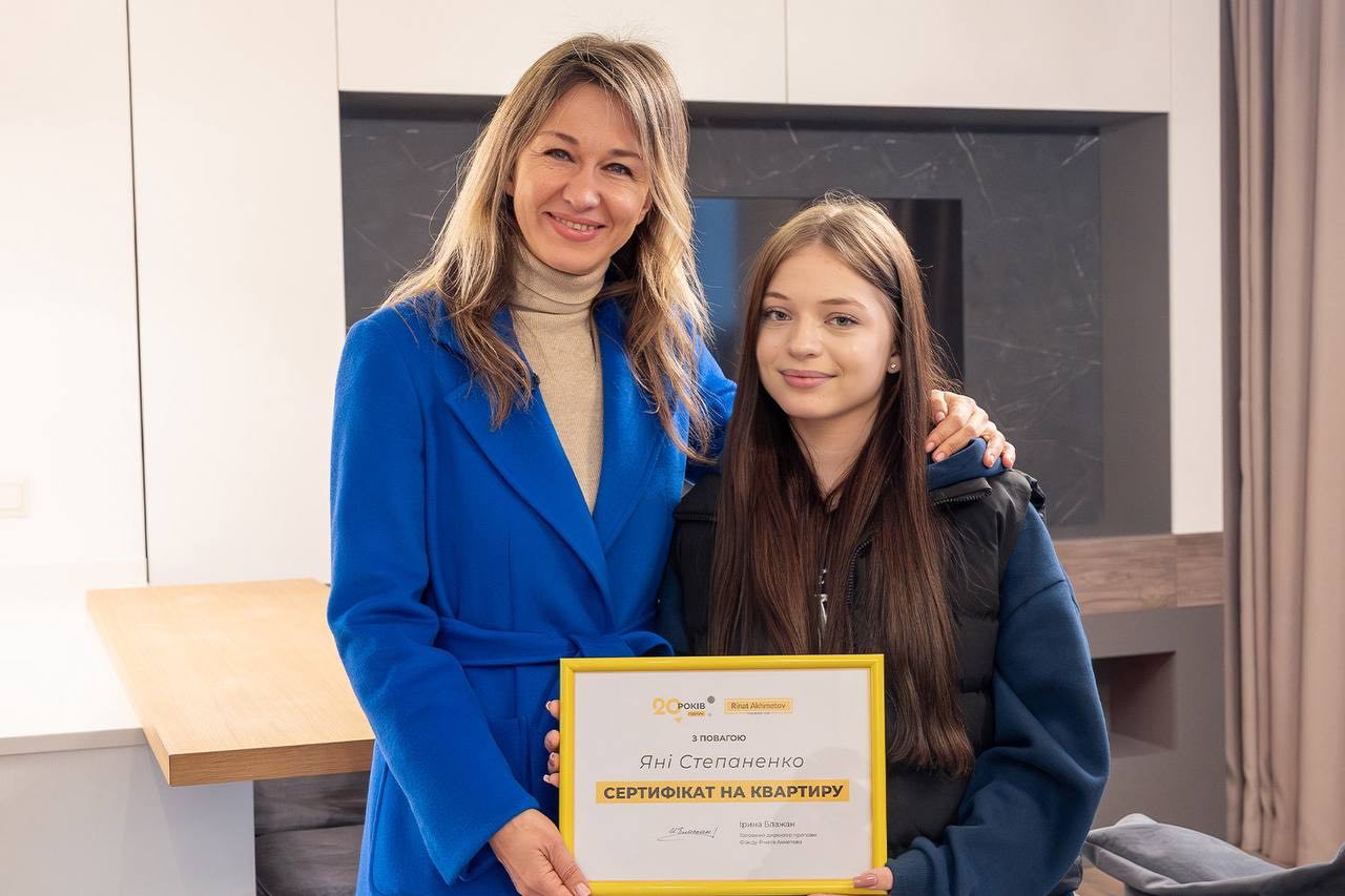 Для Фонду підтримка Яни – це щире бажання завжди бути поруч та допомагати дівчині рухатися до своїх мрій. Сертифікат на отримання квартири Яні передала програмний директор Фонду Ірина Блажан. А ключі від власної квартири Яні вручила голова наглядової ради Фонду Ріната Ахметова Наталія Ємченко.