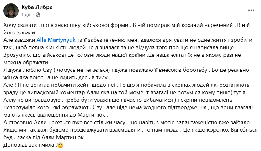 Водночас військова Олена Білозерська заявила, що ситуація перейшла у площину "травлі". Вона зазначила, що хоча Мартинюк може бути емоційною, рівень критики вийшов за межі конструктиву.