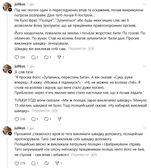 "Тільки тоді вони сказали: "Ми ж поліція, зараз викличемо швидку". Минуло 15 хвилин, швидкої не було. Тоді поліцейський сказав: "Ну набирай, викликай швидку"... Поліцейські, звичайно, викликали патрульну поліцію і сфабрикували справу. Тата затримано "за злісну непокору працівникам поліції, ніхто його не бив, не стріляв — сам упав і забився"! — продовжує Юлія.
