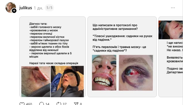 Також вона опублікувала фото побитого батька і діагнози медиків, серед яких — забій головного мозку, крововилив у мозок, переломи очниці, виличної кістки і гайморової пазухи, а також низка інших серйозних травм. На нього чекає складна операція.