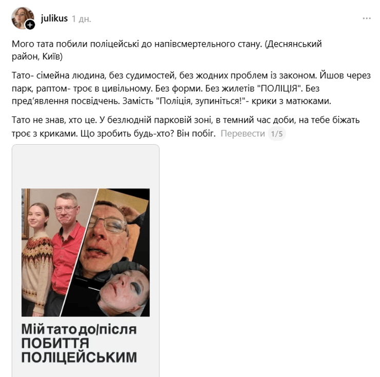 Про побиття розповіла в Treads донька постраждалого Юлія. За її словами, він — сімейна людина і ніколи не мав проблем із законом.