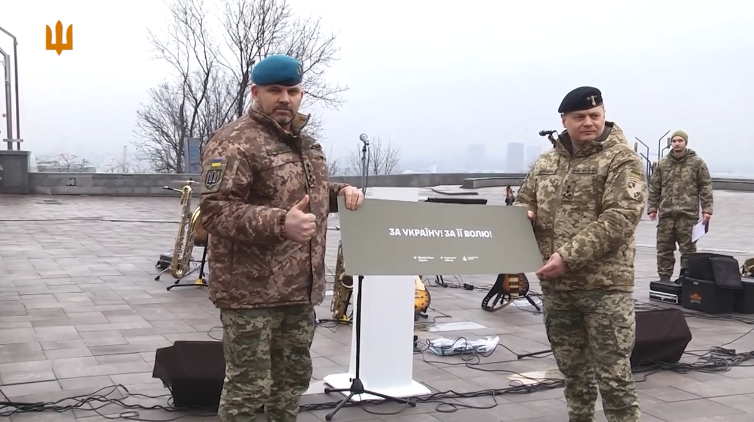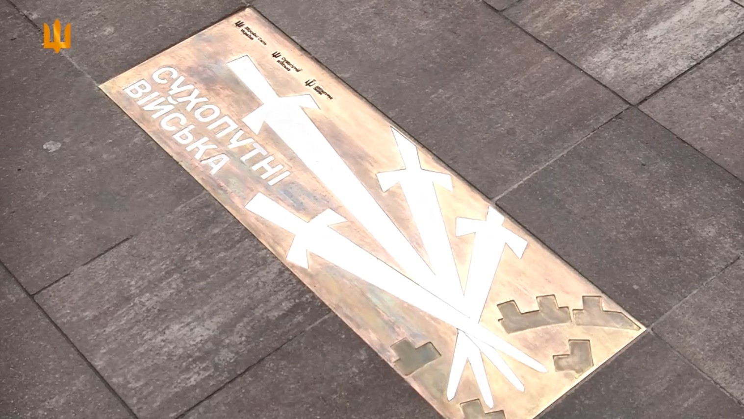 Гнатов та Шаповалов підняли табличку з гаслом Сухопутних військ "За Україну! За її волю!" Пам'ятний знак — вбудована у плиту золотиста табличка з чотирма перехрещеними мечами.