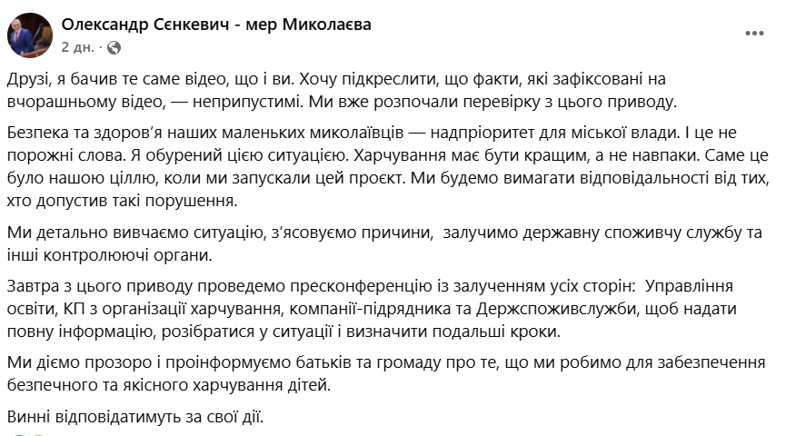 "Безпека та здоров'я наших маленьких миколаївців — надпріоритет для міської влади. І це не порожні слова. Я обурений цією ситуацією. Харчування має бути кращим, а не навпаки. Це було нашою метою, коли ми запускали цей проєкт. Ми вимагатимемо відповідальності від тих, хто допустив такі порушення. Ми детально вивчаємо ситуацію, з'ясовуємо причини, залучимо державну споживчу службу та інші контролюючі органи", — йдеться в його повідомленні.
