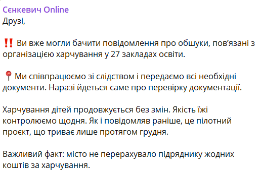 "Харчування дітей триває, як і раніше. Якість їжі контролюємо щодня. Як і повідомляв раніше, це пілотний проєкт, який триває тільки протягом грудня. Важливий факт: місто не перерахувало підряднику жодних коштів на харчування", — наголосив чиновник.