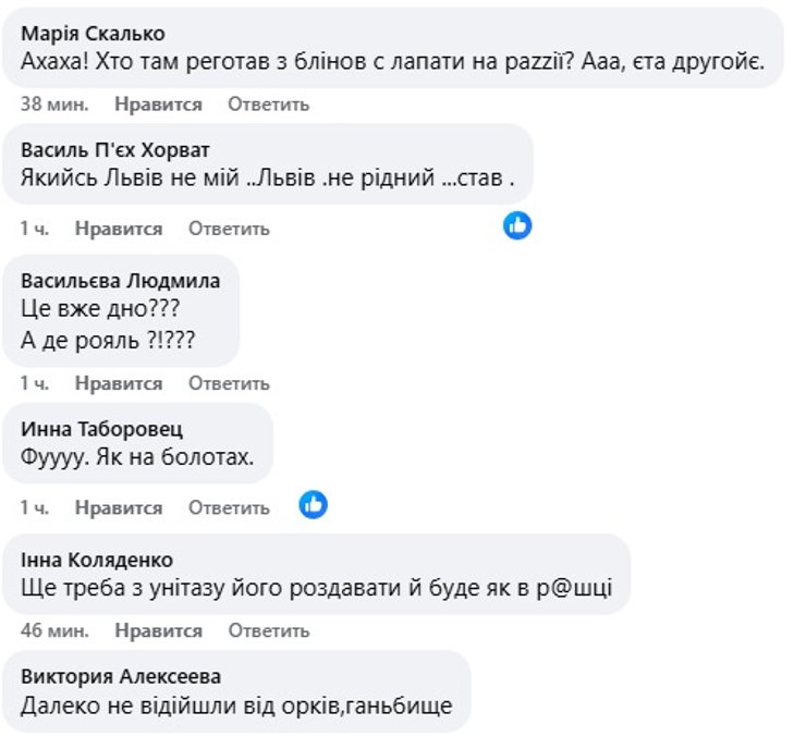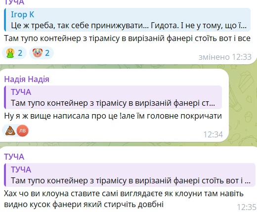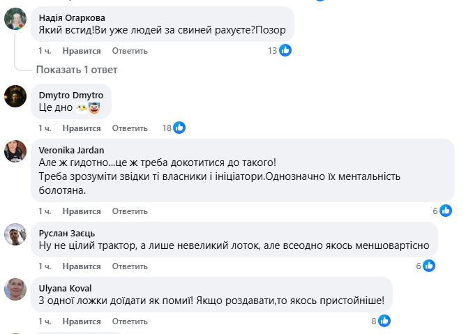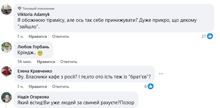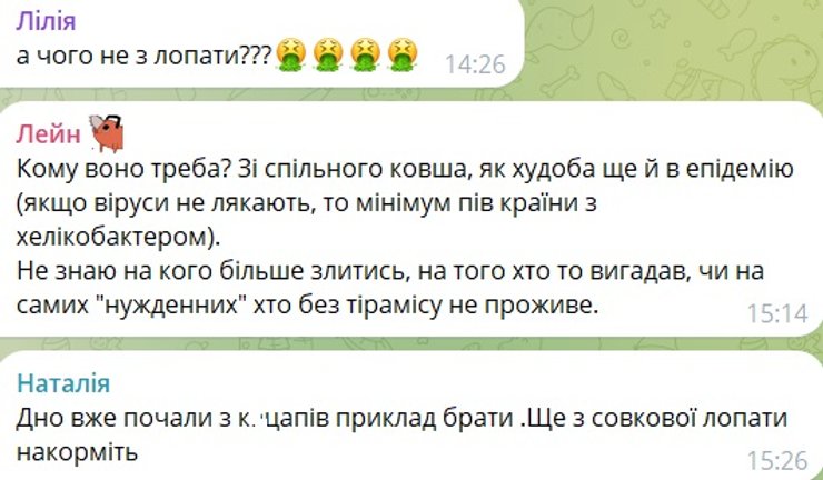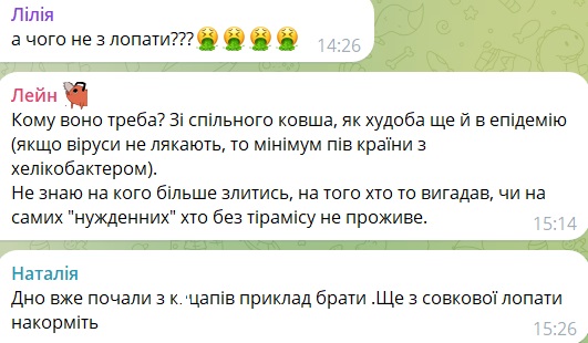"Мені одній це нагадує млинці з лопати на масляну в рашестані? Хто це робить? Навіщо? Питання риторичне", "Я обожнюю тирамісу, але ось так себе принижувати? Дуже прикро, що декому "зайшло"", "Але ж бридко... це ж треба докотитися до такого! Треба зрозуміти звідки ті власники й ініціатори. Однозначно їхня ментальність болотяна", "Хто там реготав з млинців з лопати на раzzиии? Ааа, це інше", "Це дно", "А чому не з лопати", "Кому воно потрібно? Із загального ковша, як худоба ще й в епідемію (якщо віруси не лякають, то мінімум пів країни з хелікобактером). Не знаю, на кого більше злитися, на того, хто це вигадав, чи на тих, хто "нудьгує", хто без тірамісу не проживе", — обурюються в соцмережах.