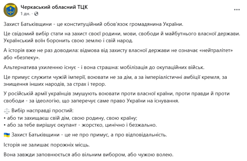 У тексті до самого допису йдеться, що захист України — конституційний обов'язок кожного громадянина. Також у ТЦК розказали про "альтернативу ухилення" від служби у лавах ЗСУ.