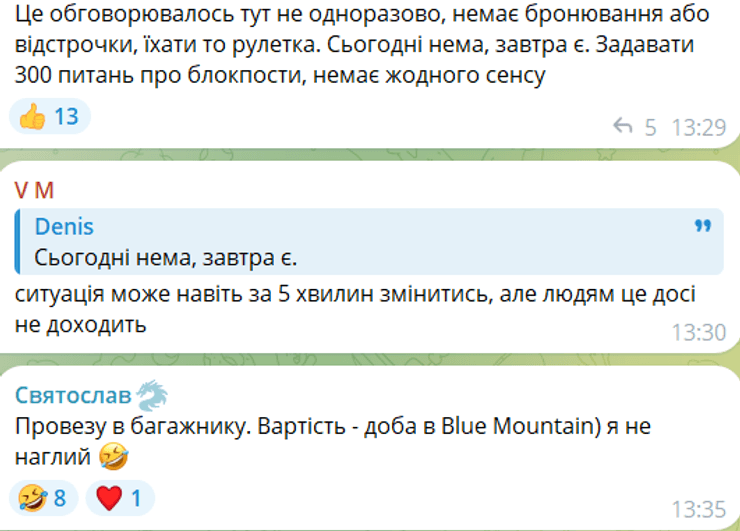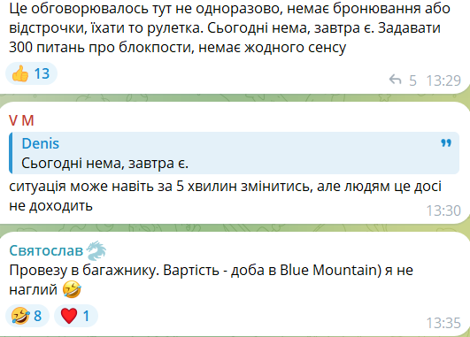 Тим часом у чатах ті, хто вже перебуває в Буковелі, і ті, хто тільки збирається туди вирушити, обмінюються своїми враженнями. Одним із животрепетних питань для декого є наявність блокпостів дорогою на курорт.