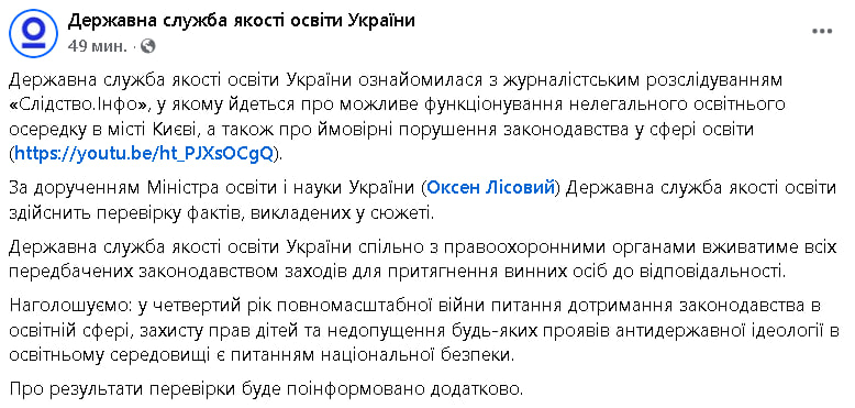 Державна служба якості освіти України на своїй сторінці у Facebook 6 січня зауважила, що ознайомилася з журналістським розслідуванням "Слідство.Інфо" про можливе функціонування нелегального освітнього осередку в Києві та ймовірні порушення законодавства у сфері освіти, і за дорученням Міністра освіти і науки України здійснить перевірку викладених фактів, вживаючи всіх передбачених законодавством заходів для притягнення винних до відповідальності.