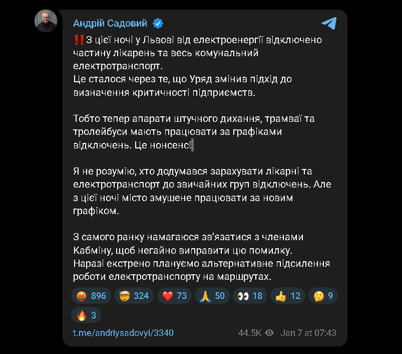 У ніч на 7 січня у Львові від електропостачання відключили частину лікарень і весь комунальний електротранспорт. Про це повідомив міський голова Львова Андрій Садовий у своєму Telegram-каналі та додав, що причиною є зміна підходу уряду до визначення об’єктів критичної інфраструктури.