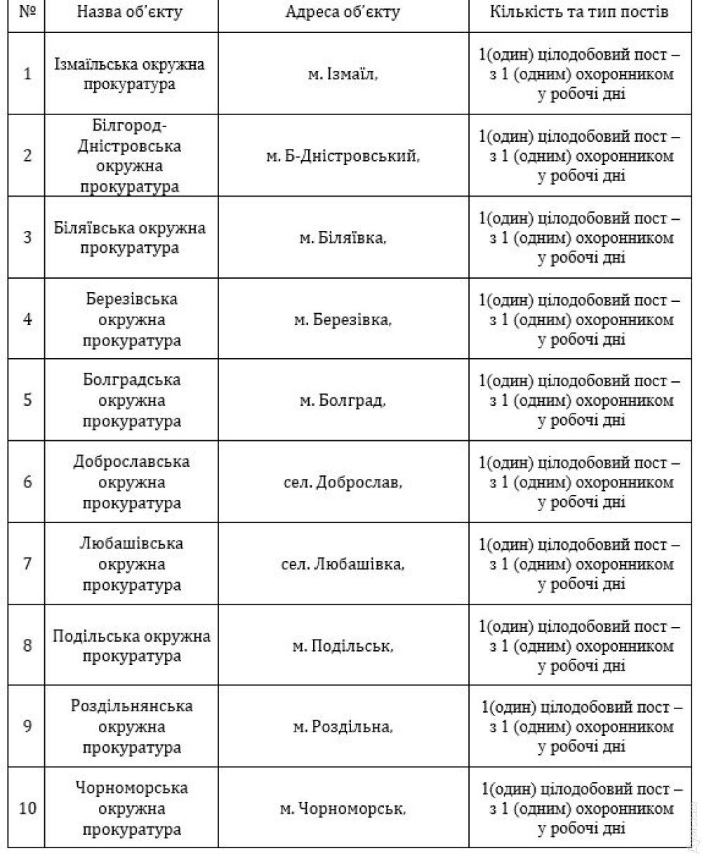 Згідно з тендером на майже 6,2 млн грн, під охорону планують передати 10 об'єктів прокуратури, де встановлять цілодобовий пост у робочі дні. У разі виникнення надзвичайних ситуацій на допомогу охоронцю має приїхати група швидкого реагування в кількості не менше двох осіб в екіпіровці.