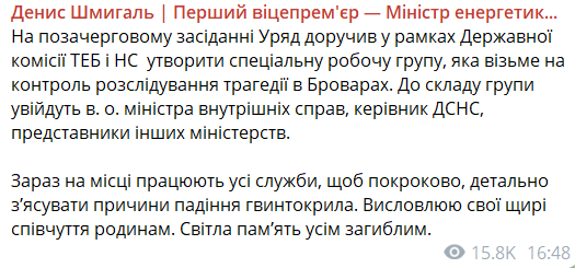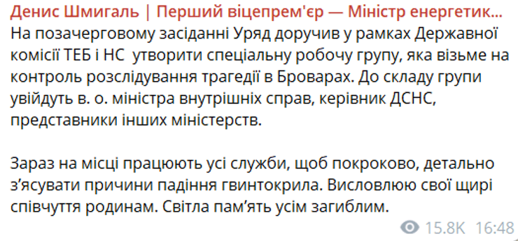"Зараз на місці працюють усі служби, щоб покроково, детально з'ясувати причини падіння вертольота. Висловлюю свої щирі співчуття родинам. Світла пам'ять усім загиблим", — писав тодішній прем'єр-міністр Денис Шмигаль.