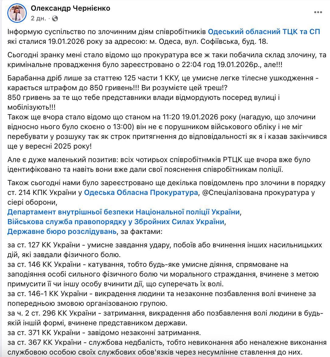 Одеський юрист Олександр Чернієнко повідомив, що проти працівників місцевого ТЦК та СП було порушено провадження за нанесення тілесних ушкоджень його клієнту. Правознавець каже, що його вразила кваліфікація та відповідальність за порушення закону.
