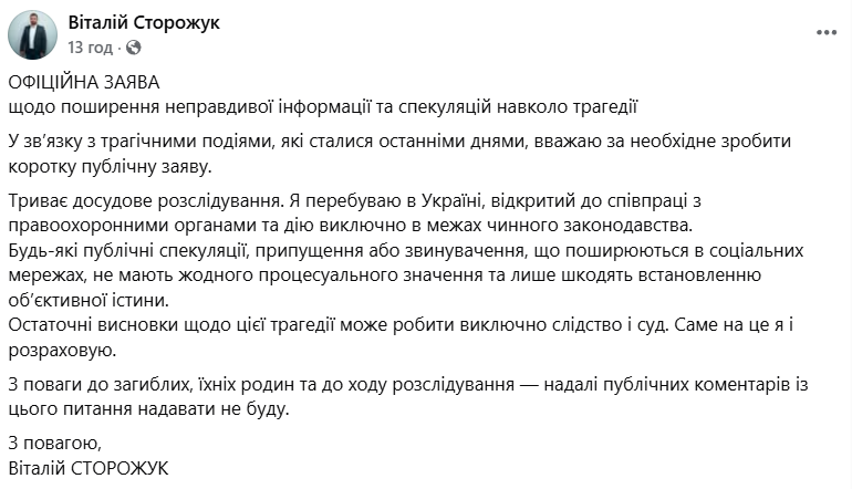 "Будь-які публічні спекуляції, припущення або звинувачення, що поширюються в соціальних мережах, не мають жодного процесуального значення та лише шкодять встановленню об’єктивної істини. Остаточні висновки щодо цієї трагедії може робити виключно слідство і суд. Саме на це я і розраховую", — написав депутат.