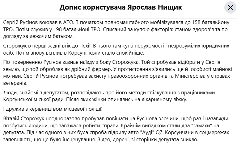 В дописі 28 січня військовий додав, що Сторожук нібито намагався відібрати в Русінова землю та "неодноразово пробував повісити на Русінова злочини". При цьому Нищик заявив, що має "питання до начальника Черкаської поліції Гудими".