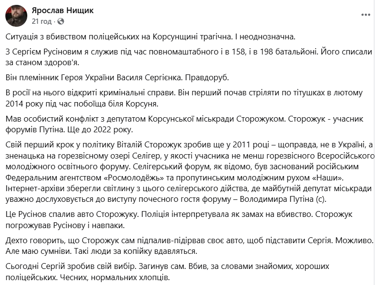 Допис про стрілянину в Черкаській області, що призвела до загибелі правоохоронців, колишній секретар Черкаської міської ради та нині військовослужбовець Ярослав Нищик опублікував 28 січня у Facebok. До того він стверджував, що підозрюваний у вбивстві чотирьох правоохоронців — його побратим Сергій Русінов, з яким вони під час повномасштабного вторгнення РФ служили в 158-му та 198-му батальйонах.