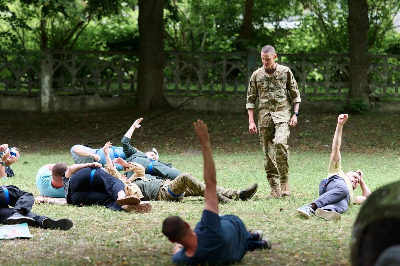 Практичне тренування учасників "Азовської школи" під керівництвом інструктора під час відпрацювання базових фізичних вправ