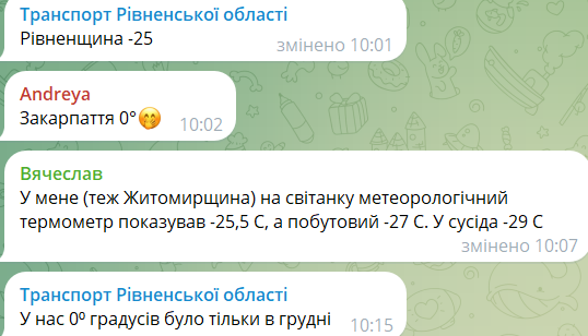 У коментарях під публікацією користувачі констатують, що на Хмельниччині вранці теж фіксували -29 градусів, а в Житомирській області, пишуть очевидці, морози коливалися від -25 до -29 градусів. У Рівненській області стовпчики термометрів опустилися до -25.