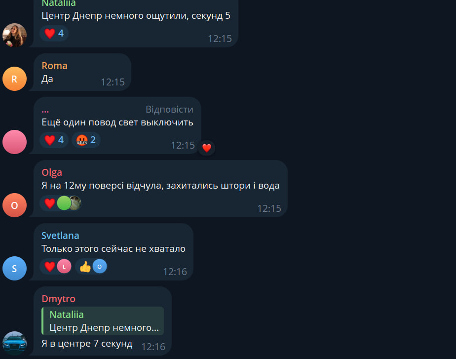 Як повідомляють місцеві Telegram-канали, під час землетрусу були помічені коливання у Дніпрі, Запоріжжі та на Донеччині. У коментарях під публікаціями багато користувачів підтверджували, що відчули поштовхи. Дехто зазначав, що легке колихання тривало декілька секунд, а у когось в будинку навіть зашаталися предмети. За словами місцевих, особливо відчутними коливання були на високих поверхах будинку.