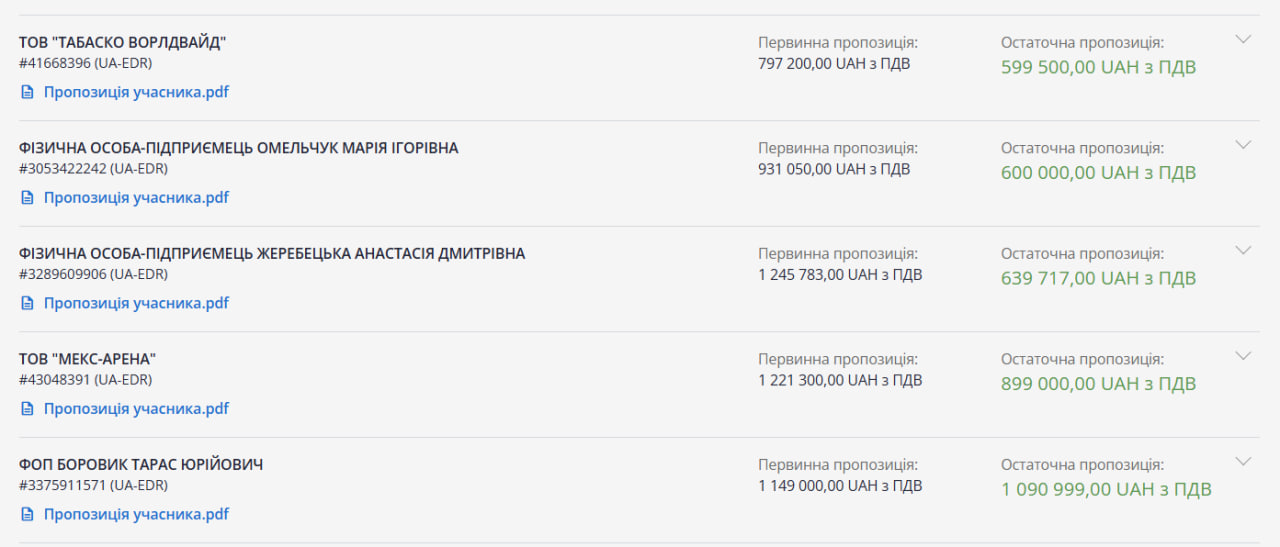 У тендері також брала участь київська рекламна компанія ТОВ "Табаско Ворлдвайд". Вона запропонувала виконати ті самі роботи дешевше — за 599,5 тис. грн, однак цю заявку відхилили.