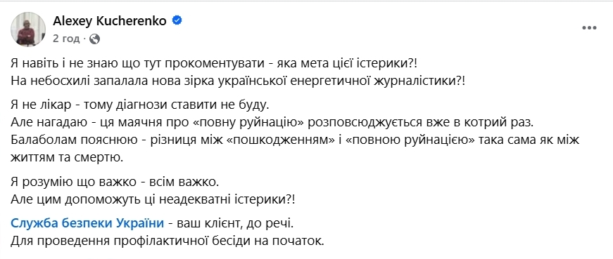 Також відреагував народний депутат та колишній міністр з питань житлово-комунального господарства України Олексій Кучеренко, який попросив Службу безпеки України звернути увагу на подібні дописи.