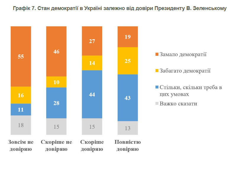 Стан демократії в Україні багато в чому залежить від довіри президенту Володимиру Зеленському. Серед тих, хто зовсім йому не довіряє, 55% опитаних вважають рівень демократії недостатнім. Серед тих, хто повністю довіряє Зеленському, рівень браку демократії — 19%.