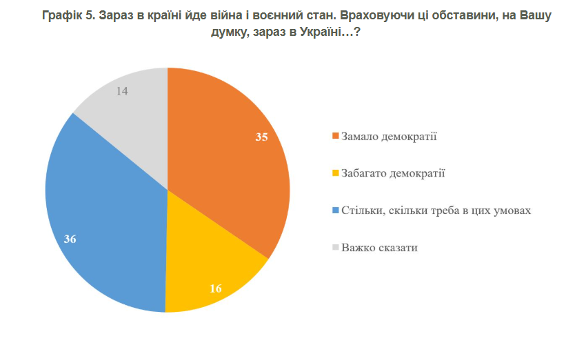 35% українців вважають, що в Україні бракує демократії, і це — на відсоток менше, ніж тих, хто вважає рівень демократії таким, яким він має бути за таких умов (36%). Ще 16% вважають, що її забагато.