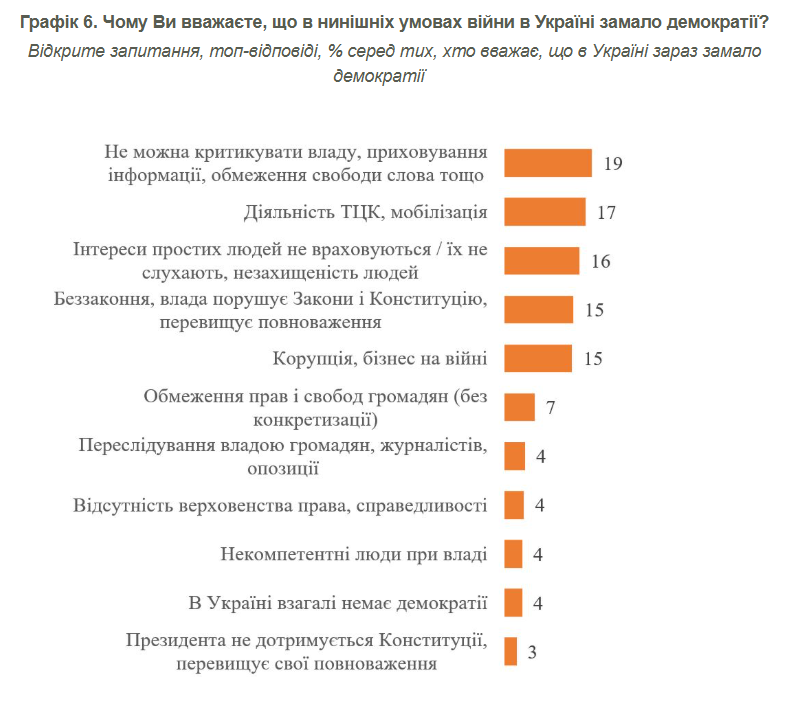 Оскільки питання мобілізації є чутливим, зазначимо, що в перерахунку всього населення є лише 6% тих, хто вважають, що в країні мало демократії і при цьому пояснюють це діями ТЦК.