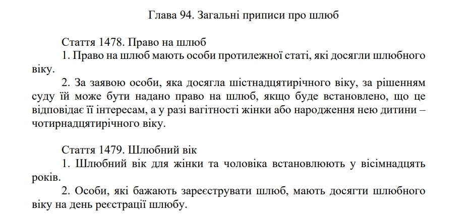 В той же час у статті 1479. "Шлюбний вік", сказано, що шлюбний вік для жінки та чоловіка встановлюють у вісімнадцять років. А особи, які бажають зареєструвати шлюб, мають досягти шлюбного віку на день реєстрації шлюбу.