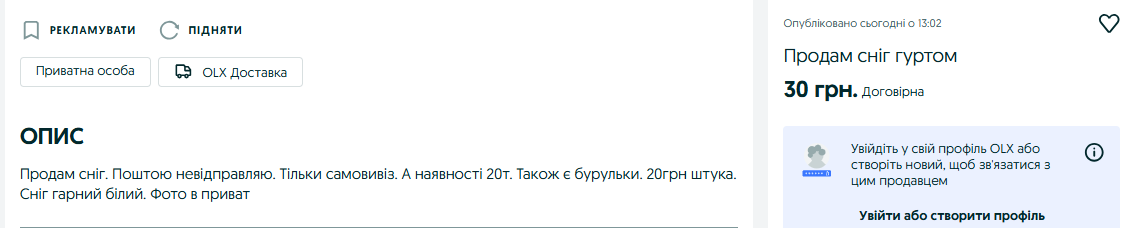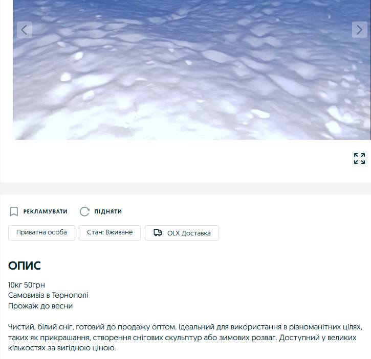 Два оголошення про продаж снігу з'явилися на OLX — одній з найбільших платформ онлайн-оголошень, що об'єднує людей для купівлі, продажу або обміну товарами та послугами.