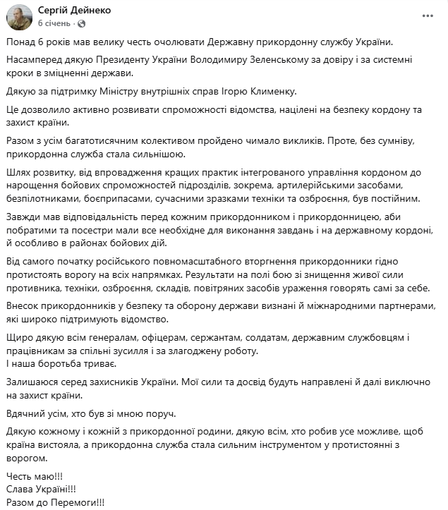 2 січня 2026 року президент України Володимир Зеленський анонсував заміну глави ДПСУ і заявив, що Сергій Дейнеко отримає нову посаду в системі Міністерства внутрішніх справ.