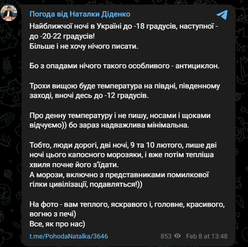 "Про денну температуру і не пишу, носами і щоками відчуємо, бо зараз надважлива мінімальна. Тобто, люди дорогі, дві ночі, 9 та 10 лютого, лише дві ночі цього капосного морозяки", — констатує спеціалістка.