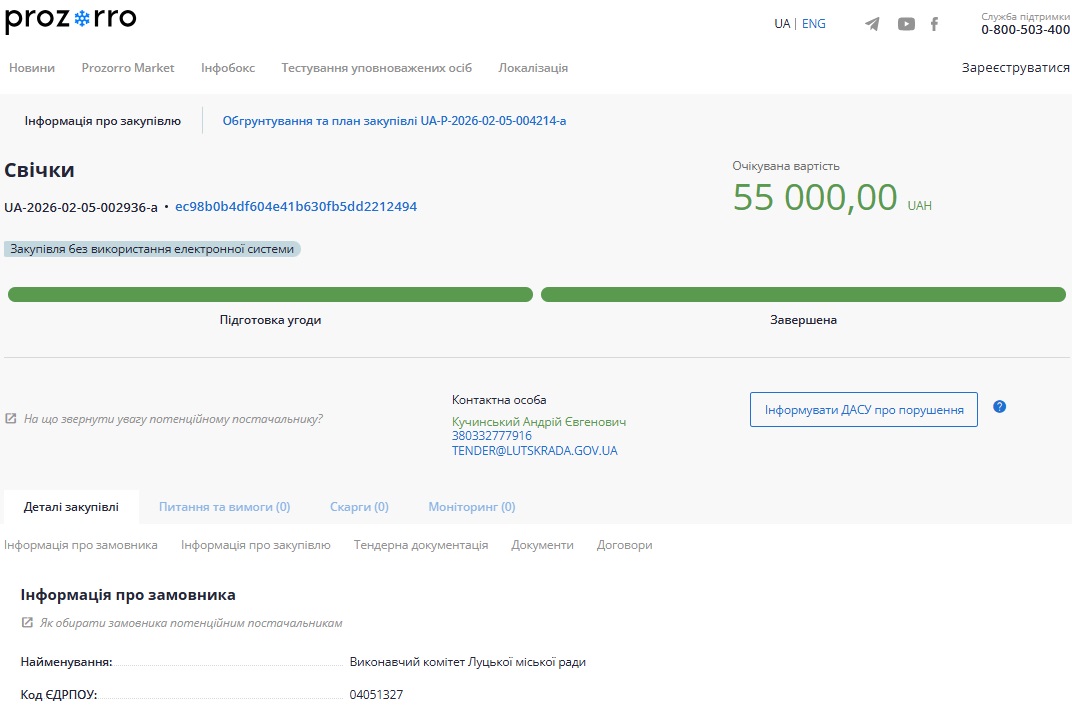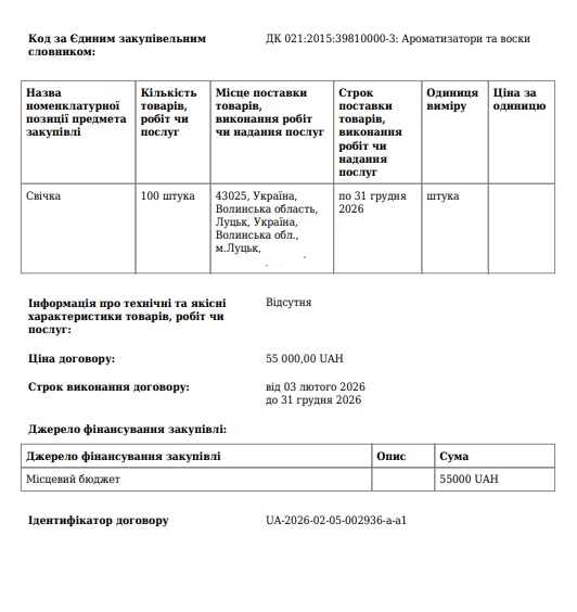 Виконавчий комітет Луцької міської ради провів тендер на закупівлю 100 аромасвічок на суму 55 тисяч гривень, тобто по 550 грн за одну.
