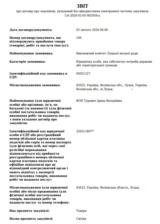 Згідно з опублікованим протоколом торгів, тендер виграла приватна підприємиця Ірина Туревич. Товар має бути поставлено до кінця 2026 року.
