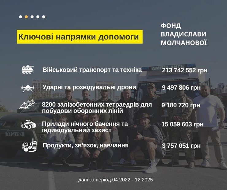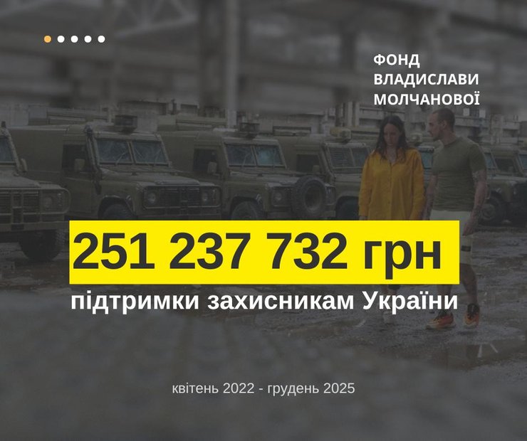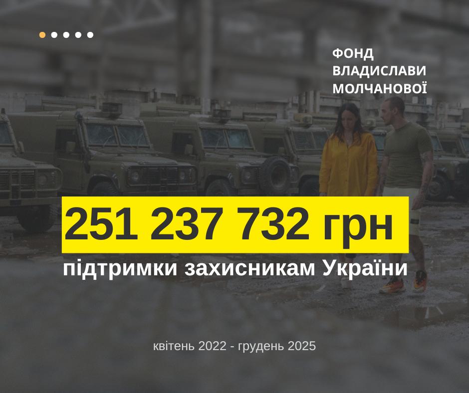 Фонд Владислави Молчанової оприлюднив звіт про діяльність за 2022–2025 роки. Загальна сума допомоги Силам оборони України становить понад 251 млн грн.