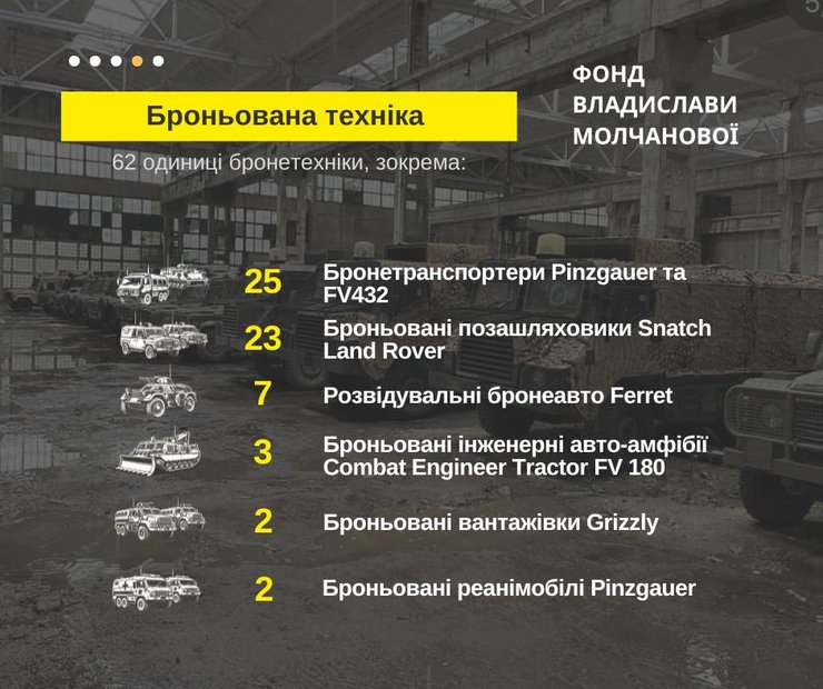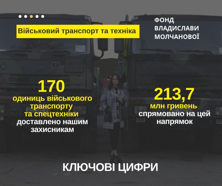 Найбільшу частину коштів — понад 213 млн грн — спрямовано на військовий транспорт та спецтехніку. За цей період передано 170 одиниць техніки, серед яких броньовані автомобілі, бронетранспортери, військова інженерна та будівельна техніка, паливозаправники, пожежні авто, позашляховики та пікапи.