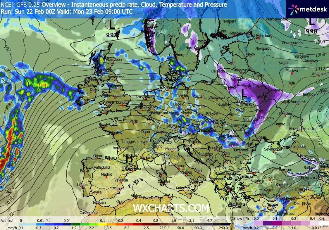 Синоптична ситуація у Європі на понеділок, 23 лютого