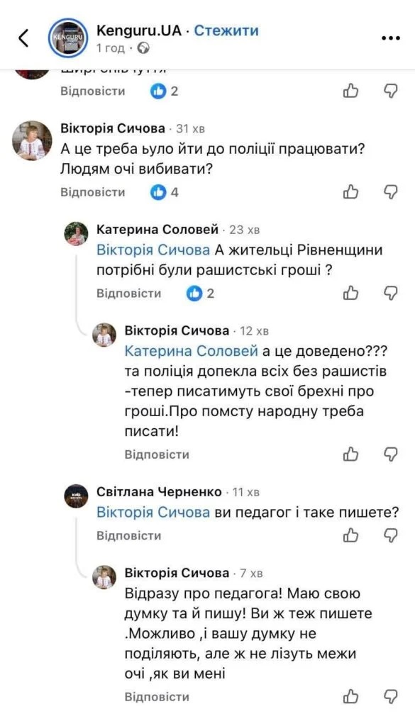 Її позицію заскринили та поширили у соцмережах. З'ясувалося, Вікторія Сичова працює вчителем української мови та літератури Живанівської філії КЗ "Компаніївський ліцей Компаніївської селищної ради Кіровоградської області".