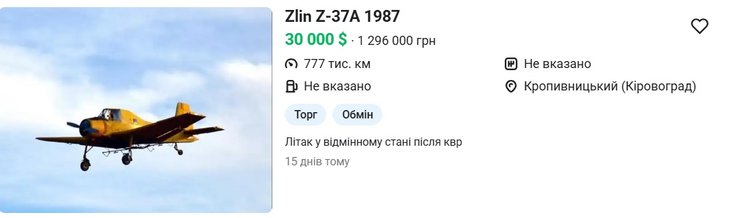 Наприклад, Zlin Z-37A 1987, чехословацький одномоторний низькоплан, продавець із Кропивницького продає за $30 тисяч.