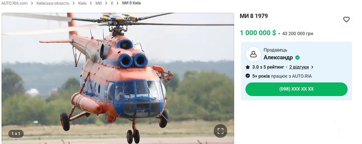 За 43 200 000 гривень продавець пропонує гелікоптер з потужністю двигуна 1700 к.с., максимальною швидкістю польоту 250 км/год і з максимальною дальністю пасажирського польоту 500 км.