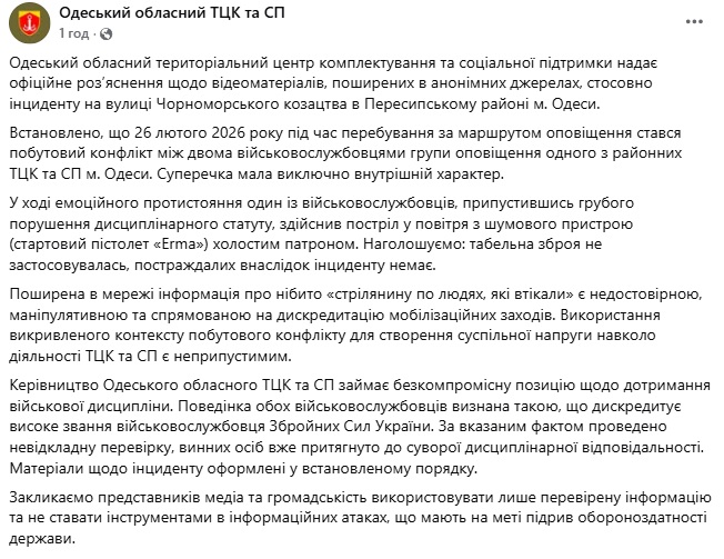 "Поширена в мережі інформація про нібито "стрілянину по людях, які тікали" є недостовірною, маніпулятивною та спрямованою на дискредитацію мобілізаційних заходів. Використання викривленого контексту побутового конфлікту для створення суспільного напруження навколо діяльності ТЦК і СП є неприпустимим", — наголосили в установі.