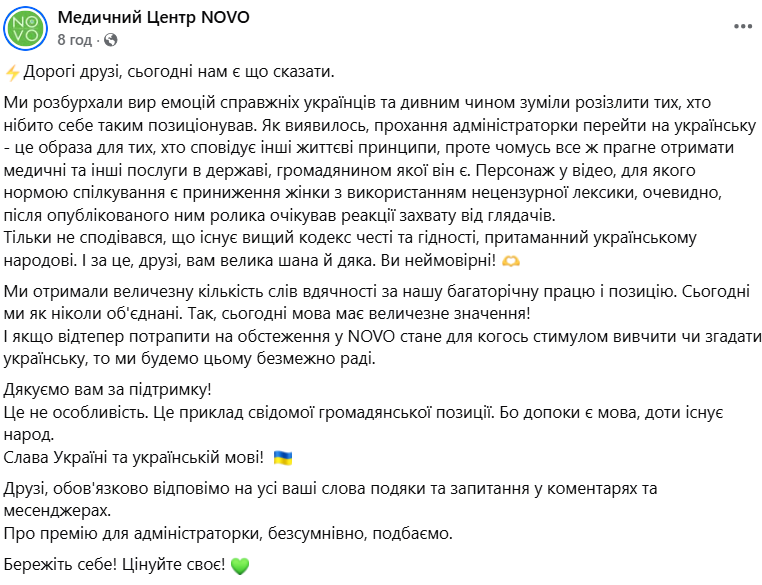 "І якщо відтепер потрапити на обстеження у NOVO стане для когось стимулом вивчити чи згадати українську, то ми будемо цьому безмежно раді", — йдеться у заяві компанії.