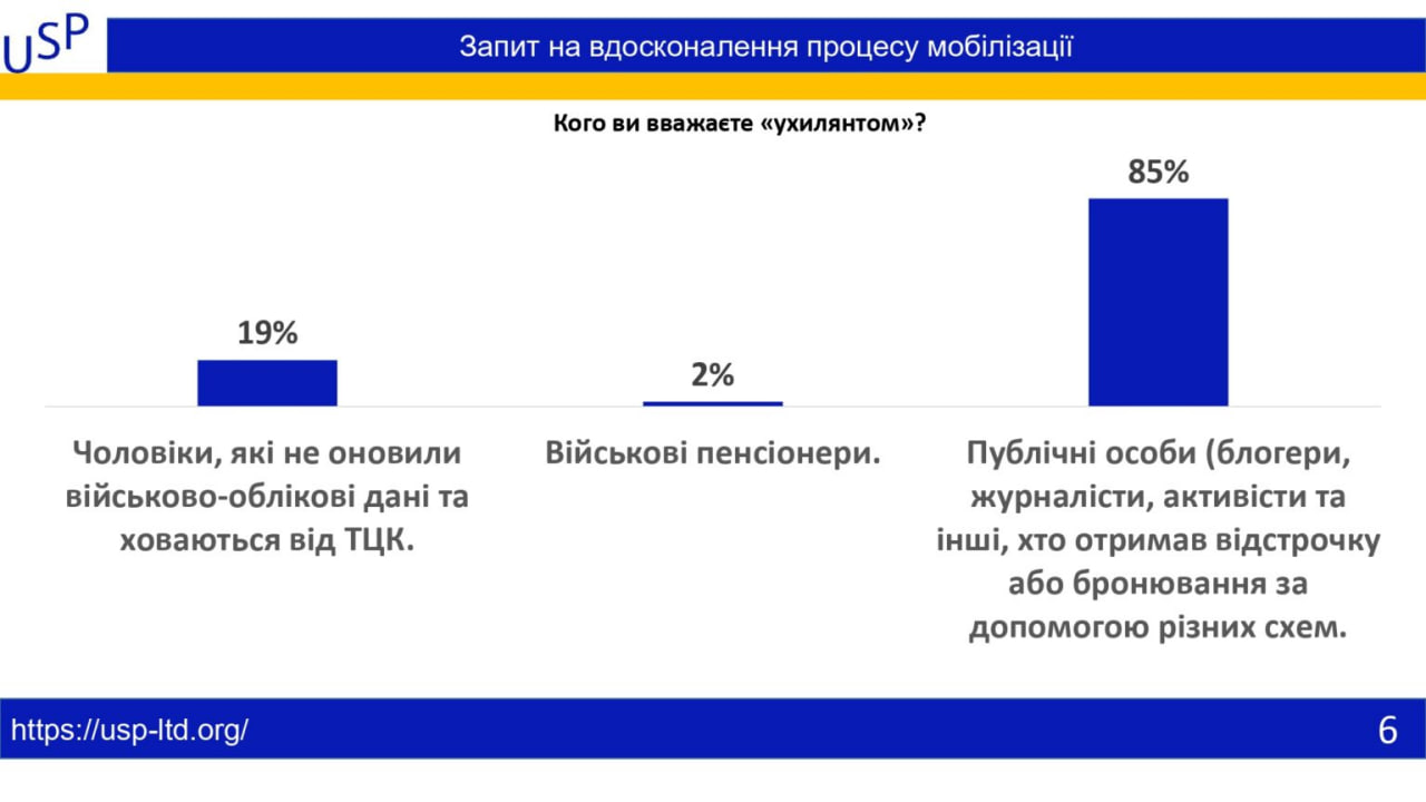 Особливу увагу соціологи звернули на образ "ухилянта". Так, 85% опитаних віднесли до цієї категорії публічних людей, які скористалися привілеями або схемами, щоб уникнути служби. Водночас 19% респондентів вважають "ухилянтами" чоловіків, які не оновили військові облікові дані та уникають контактів із територіальними центрами комплектування. Лише 2% зарахували до "ухилянтів" військових пенсіонерів.